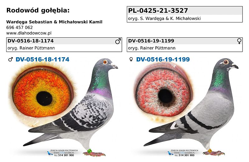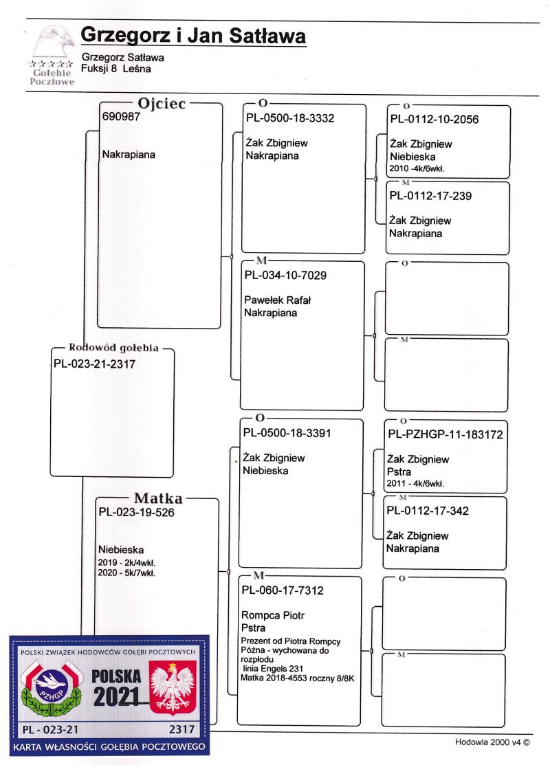 Dzisiaj jak przystało na sobotę mamy kolejne loty konkursowe w gołębnikach PLGP. Wiemy że zakończyły się już loty w oddziałach PZHGP 0262 Opole II, 023 Lipowa, -0402 Sandomierz, 0219 Gatka i u Mariana Vorcaka na Słowacji 029 Orava. Kolega Marek Stachowski przysłał nam już film pokazujący przylot gołębi natomiast na kolejne filmy czekamy. Patryk Wróbel natomiast dostarczył nam już listę przylotu gołębi w jego gołębniku. Tak więc znamy już kolejność w jakiej gołębie tam przylatywały. Jakie zdobyły konkursy w oddziale na pewno tez wkrótce się dowiemy. Na bieżąco będziemy starali się wszystkie te informacje uzupełniać. W gołębniku u Patryka Wróbla w Łubnianach pierwsze zameldowały się ptaki PL-0425-21-3527 spółki Wardęga & Michałowski, PL-023-21-2317 Grzegorza Satławy i PL-078-21-8432 Dariusza Drawca. Poniżej prezentujemy ich rodowody. Rodowody pierwszych gołębi z pozostałych gołębników też pokażemy musimy tylko otrzymać informacje które to gołębie były.