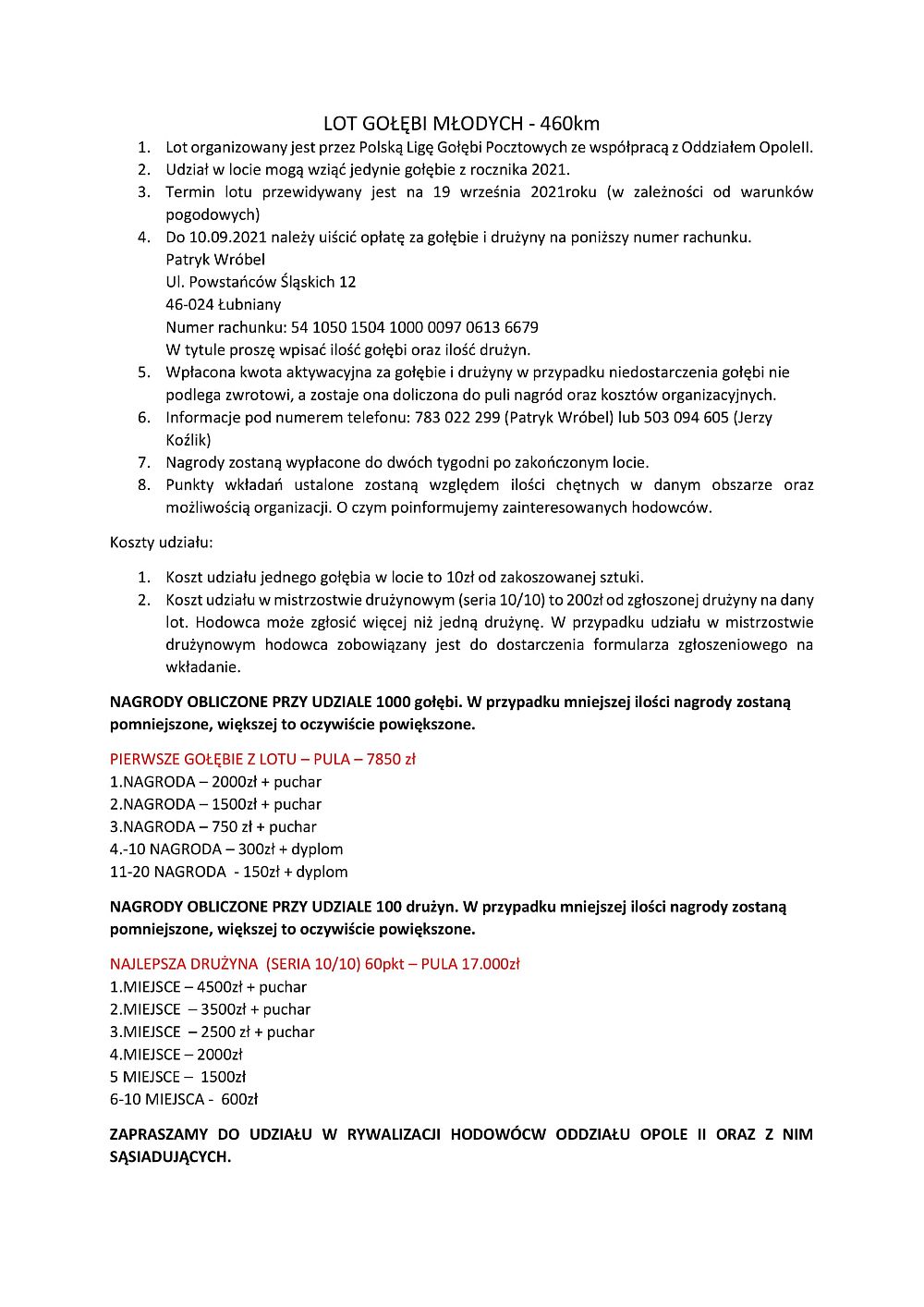 Dla hodowców z Oddziału 0262 Opole II i okolicznych planujemy zorganizować specjalny dodatkowy lot gołębi młodych na dystansie 460 km. Kto i na jakich zasadach może wziąć w nim udział oraz jakie są koszty uczestnictwa oraz wysokość nagród dowiecie z zamieszczonego poniżej regulaminu. Można tam też pobrać formularz zgłoszeniowy. W przypadku jakichkolwiek pytań i wątpliwości informacji udzielają po numerami telefonów: 783 022 299 (Patryk Wróbel) lub 503 094 605 (Jerzy Koźlik)