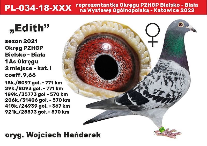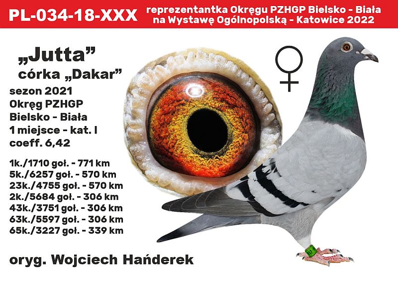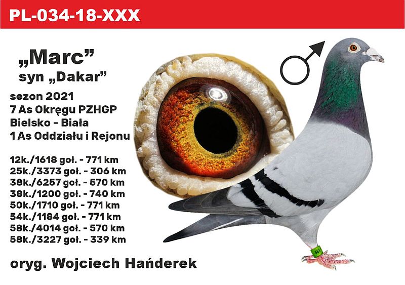 W Oddziale PZHGP 072 Rumia w drużynie Zdzisława Lademanna sezon rozpoczynało między innymi 5 oryginalnych gołębi Wojciecha Hańderka. Po zakończeniu sezonu zostały wszystkie i co ciekawe jeden z nich wybitnie się wyróżnił. Był gołąb, który pochodził z linii słynnego "Dakara" kolegi Wojciecha Hańderka, jest jego wnukiem. Jest też synem samicy "Jutta" która w tym sezonie zajęła 1 miejsce w Okręgu PZHGP Bielsko - Biała w kat. I i będzie reprezentowała ten okręg na Wystawie Ogólnopolskiej w Katowicach. Ona jest córką "Dakara", jej coeff. to 6,42. Kolega Wojciech w tym sezonie miał tez wiele innych gołębi, które bardzo dobrze się spisywały. To co je prawie wszystkie łączy to wspólny przodek a mianowicie "Dakar". Te gołębie które były lotowane przez kolegę Zdzisława w oddziale w Rumii też w większości wywodzą się z tego ptaka. Dzisiaj kończy się aukcja tych gołębi. Kolejne z innych oddziałów będą wkrótce teraz jednak zapraszamy do licytowania tych lotników. Kiedy robiliśmy zdjęcia tym gołębiom kolega Zdzisław nam je zaprezentował dzięki czemu możemy je bliżej poznać.