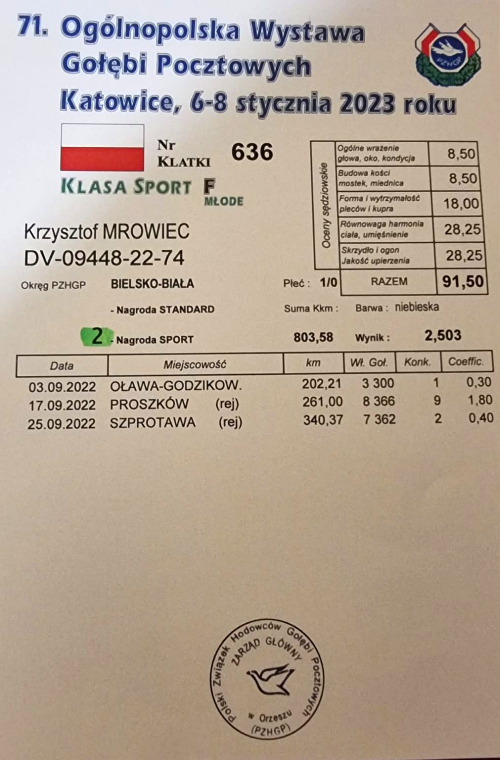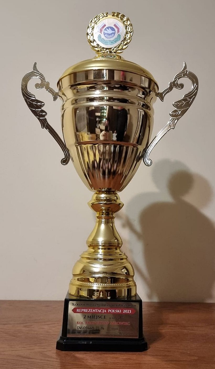 W dniu dzisiejszym kolega Krzysztof Mrowiec przysłał nam zdjęcie pucharu, który otrzymał gołąb za zdobycie drugiego miejsca w kat. sport F na 71. Ogólnopolskiej Wystawie Gołębi Pocztowych - Katowice 2023. Gołąb ten będzie reprezentował Polskę na Europejskiej Wystawie Gołębi Pocztowych, która odbędzie się już wkrótce w mieście Breszów (Bresov) w Rumuni. Gołąb ten pochodzi z hodowli kolegi Piotra Wójcickiego. Jak widzimy w rodowodzie jest to ptak praktycznie w 75% wywodzący się z gołębi Dirka Van Den Bulcka z lini gołębia "Kittel" oraz w 25% z gołębi Patricka Boeckxa z lini słynnego "Sagana". Wypada też wspomnieć , ze "Sagan" jest gołębiem z gołębi Dirka Van Den Bulcka. Przypominamy także, że gołąb ten był lotowany w Oddziale 023 Lipowa w Okręgu PZHGP Bielsko Biała. Już niedługo zaprezentujemy inne gołębie lotowane u kolegi Krzysztofa które też reprezentowały Okręg PZHGP Bielsko- Biała na 71. Ogólnopolskiej Wystawie Gołębi - Katowice 2023.