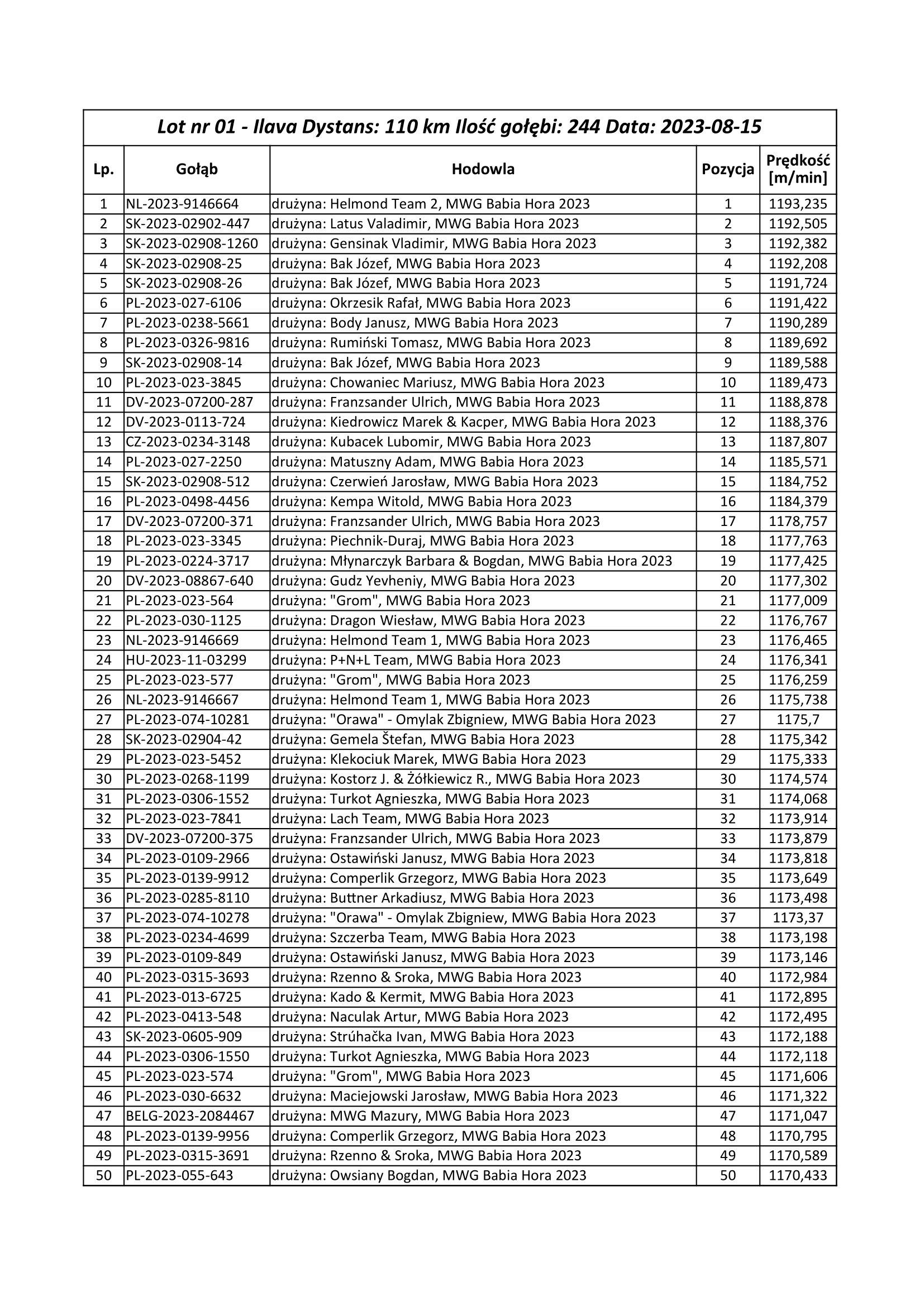 Dzisiaj na MWG Babia Hora odbył się pierwszy lot konkursowy. Na lot zakoszowano 244 gołębie i wypuszczono je w miejscowości Ilava z odległości 110 km o godzinie 07:00. Pierwsze gołębie w dużej grupie pojawiły się o godzinie 08:32. Kolejne ptaki również przylatywały w grupach. Do tego momentu jest ich już 209 sztuk. System jest cały czas włączony i kolejne, które dolecą rejestruje. Tymczasem tutaj możemy się zapoznać z aktualną listą przylotów.