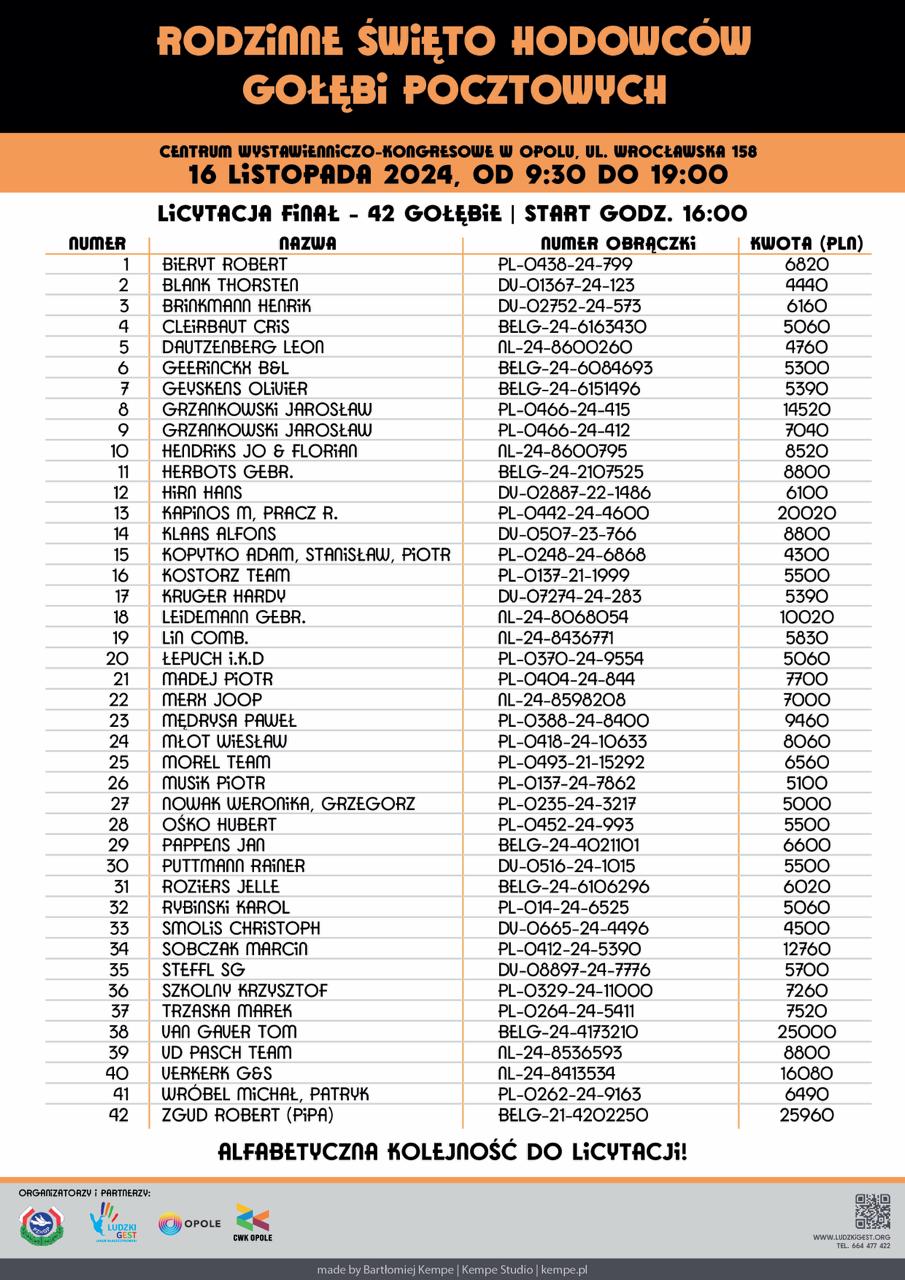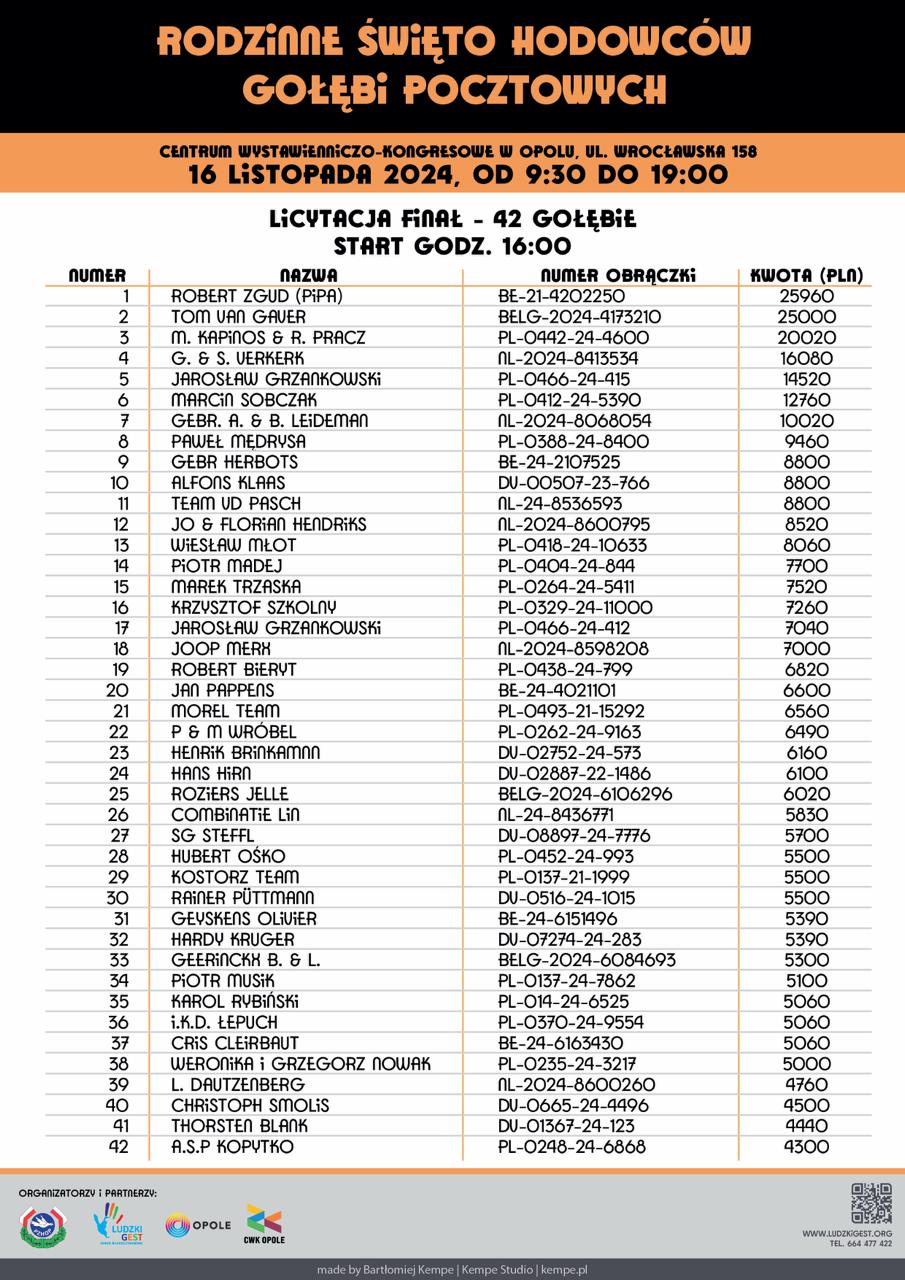 W niedziele zakończyła się preaukcja gołębi licytowanych na rzecz podopiecznych Fundacji Ludzki Gest Jakuba Błaszczykowskiego. Suma, za którą zostały gołębie wylicytowane jest naprawdę ogromna, ale to nie wszystko. 42 gołebie, które na preaukcji osiągnęły najwyższą cenę będą jeszcze licytowane podczas Rodzinnego Święta Hodowców Gołębi Pocztowych w Opolu 16 listopada. Początek planowany jest na godzine 16:00. Poniżej prezentujemy listę gołębi, które będą licytowane na aukcji stacjonarnej.