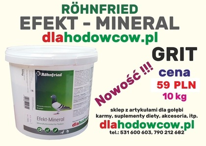 ROHNFRIED Efekt - Mineral 10 kg - sklep dlahodowcow.pl - po dłuższej przerwie znowu w sklepie w Krosinie możemy nabyć wiaderka z mieszanką minerałów dla naszych gołębi. Co najważniejsze cena jest bardzo atrakcyjna a mianowicie tylko 55 PLN za wiaderko aż do wyczerpania zapasów.
