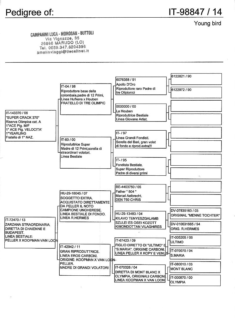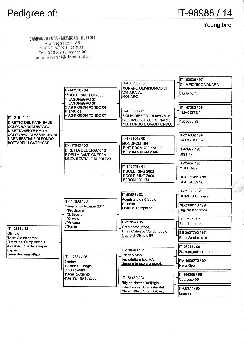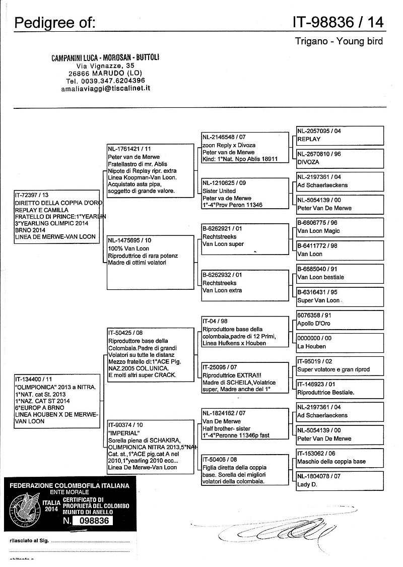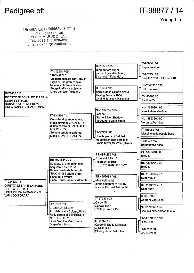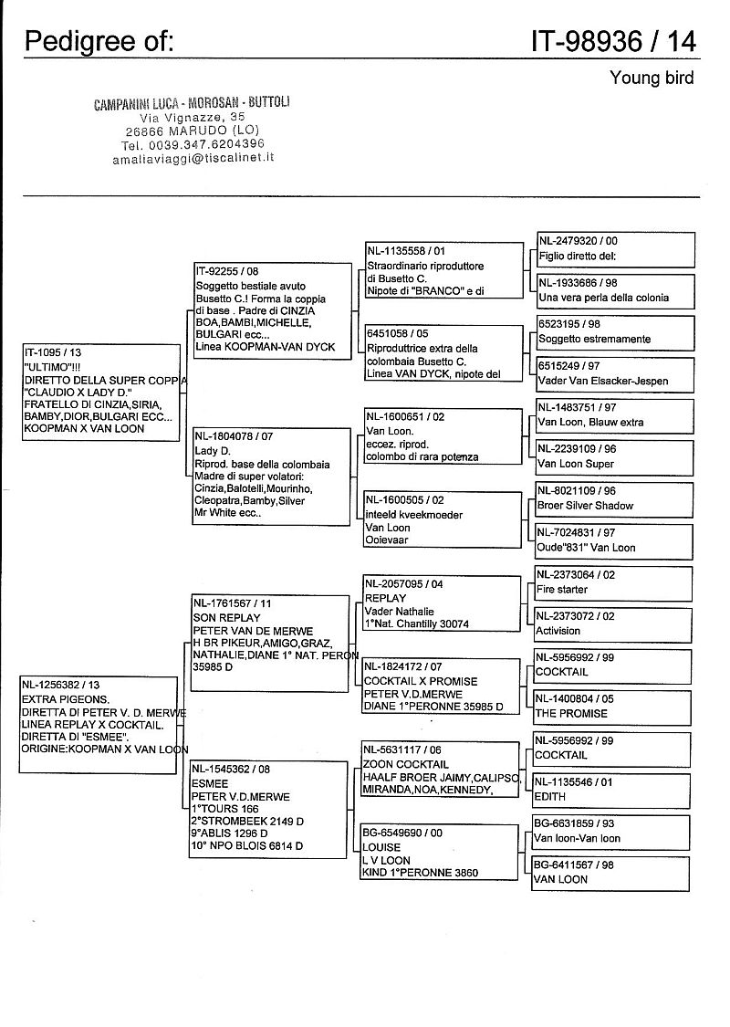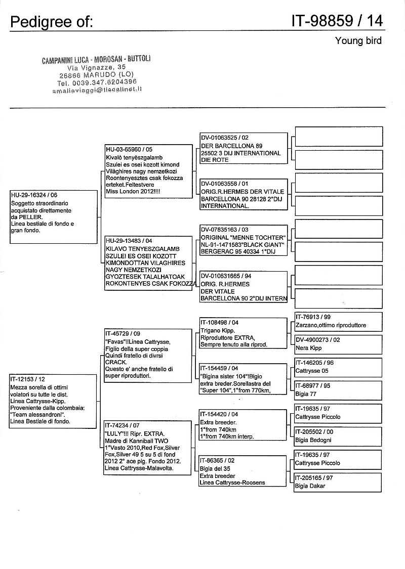 W dniach 10, 11 i 12 maja 2014 roku planujemy zorganizować 3 aukcje gołębi młodych rocznika 2014 tego włoskiego hodowcy. Aukcje będą zorganizowane w Chojnowie, Koziegłówkach i na Wspólnym Gołębniku Mazowsze (Czarna pod Mińskiem Mazowieckim).
