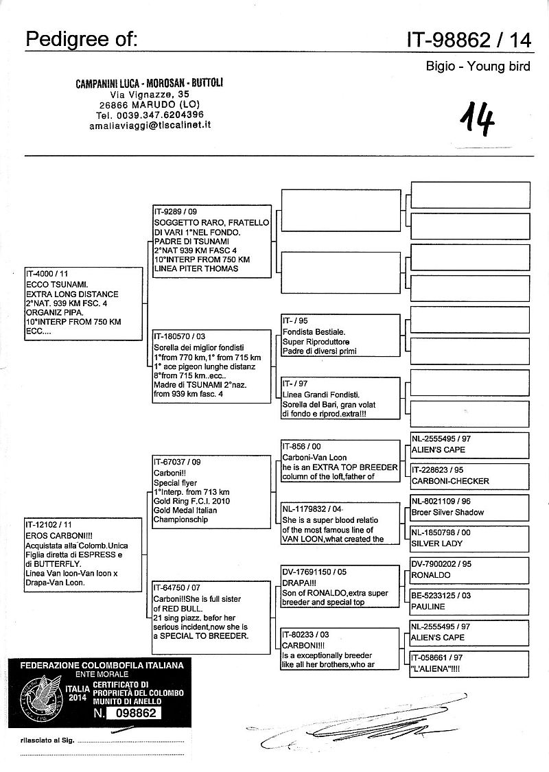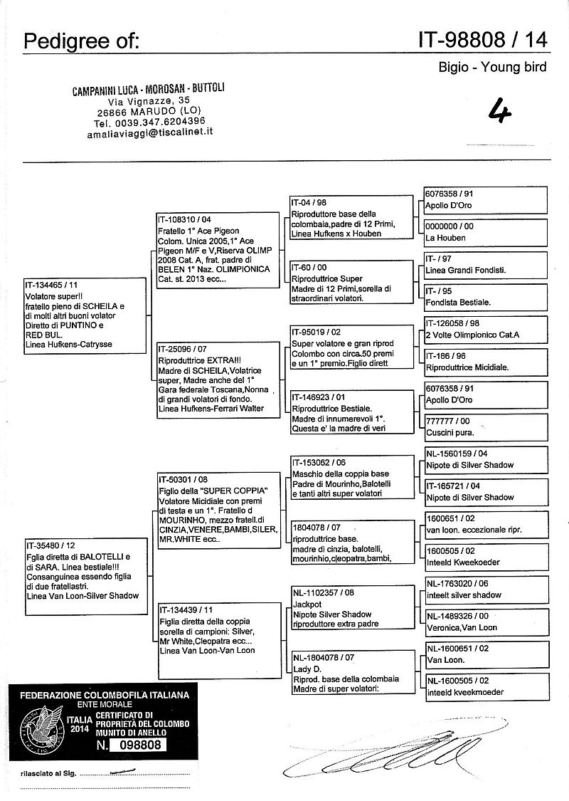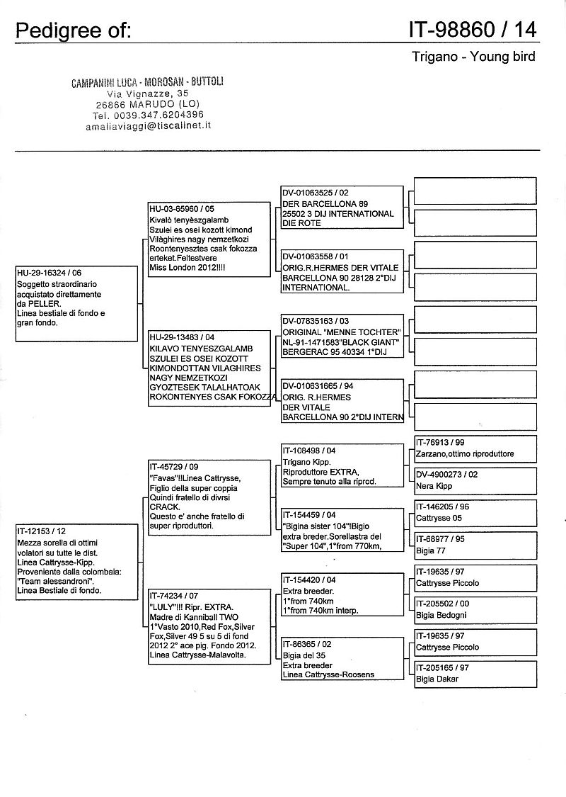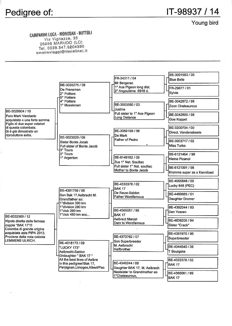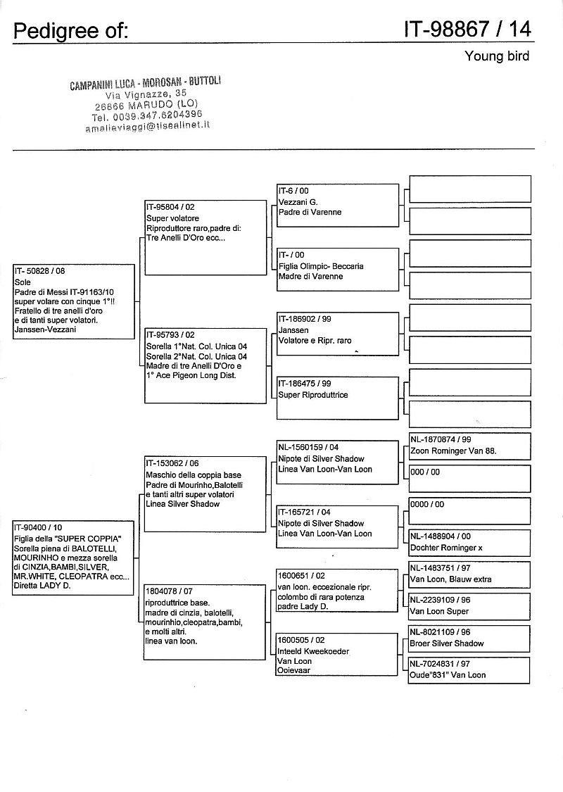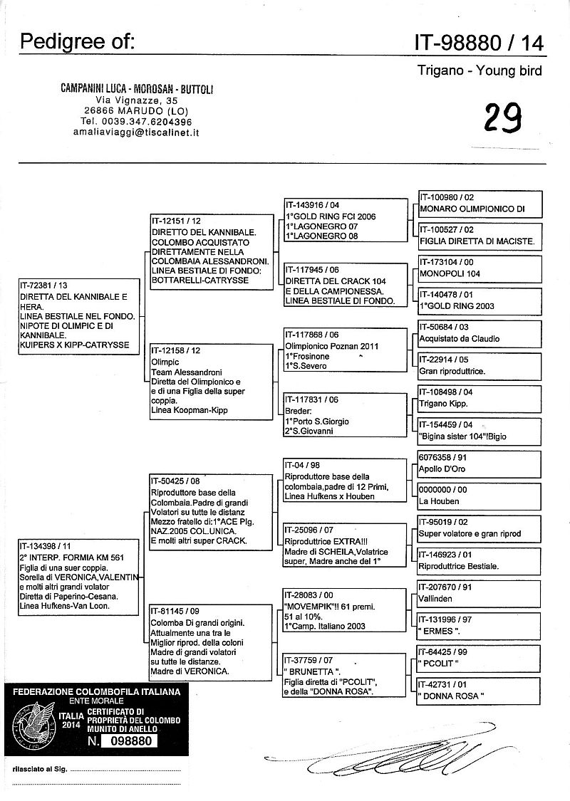 W dniach 10, 11 i 12 maja 2014 roku planujemy zorganizować 3 aukcje gołębi młodych rocznika 2014 tego włoskiego hodowcy. Aukcje będą zorganizowane w Chojnowie, Koziegłówkach i na Wspólnym Gołębniku Mazowsze (Czarna pod Mińskiem Mazowieckim).