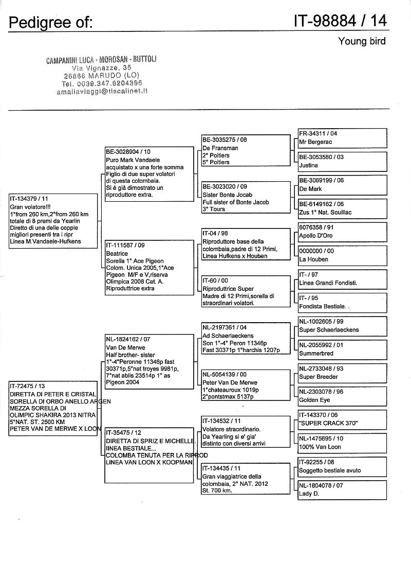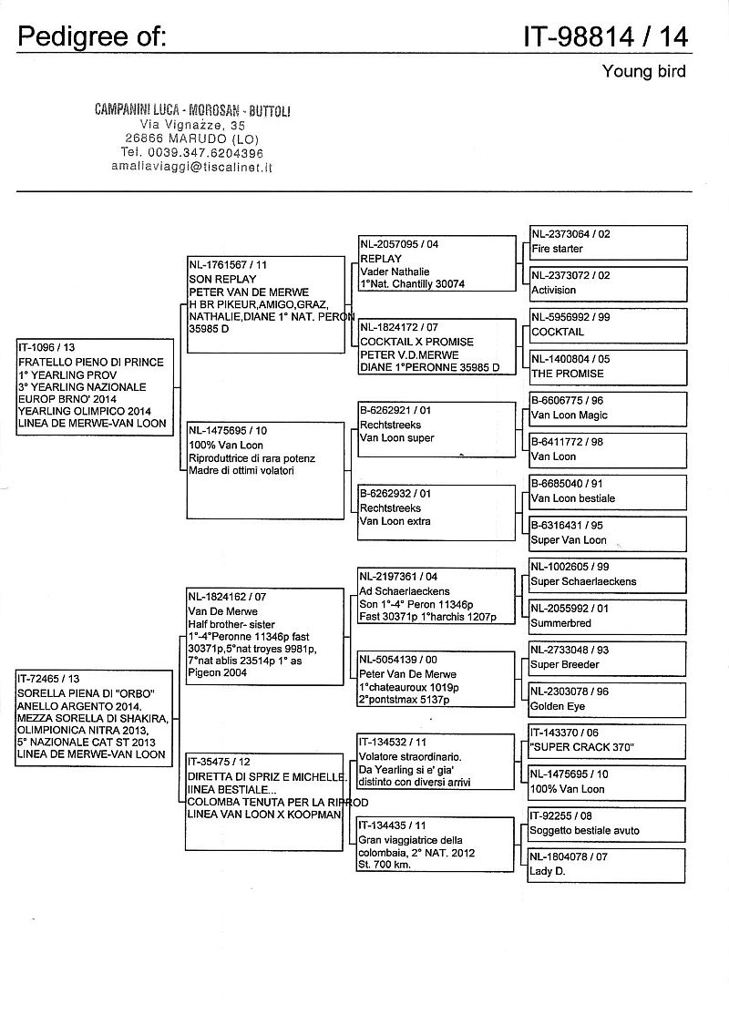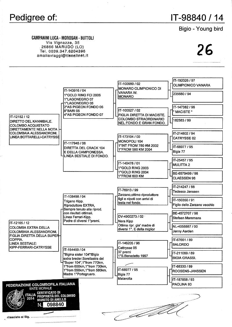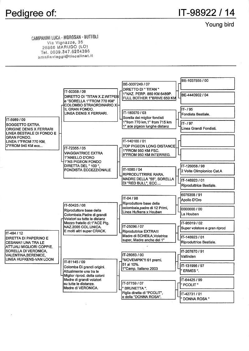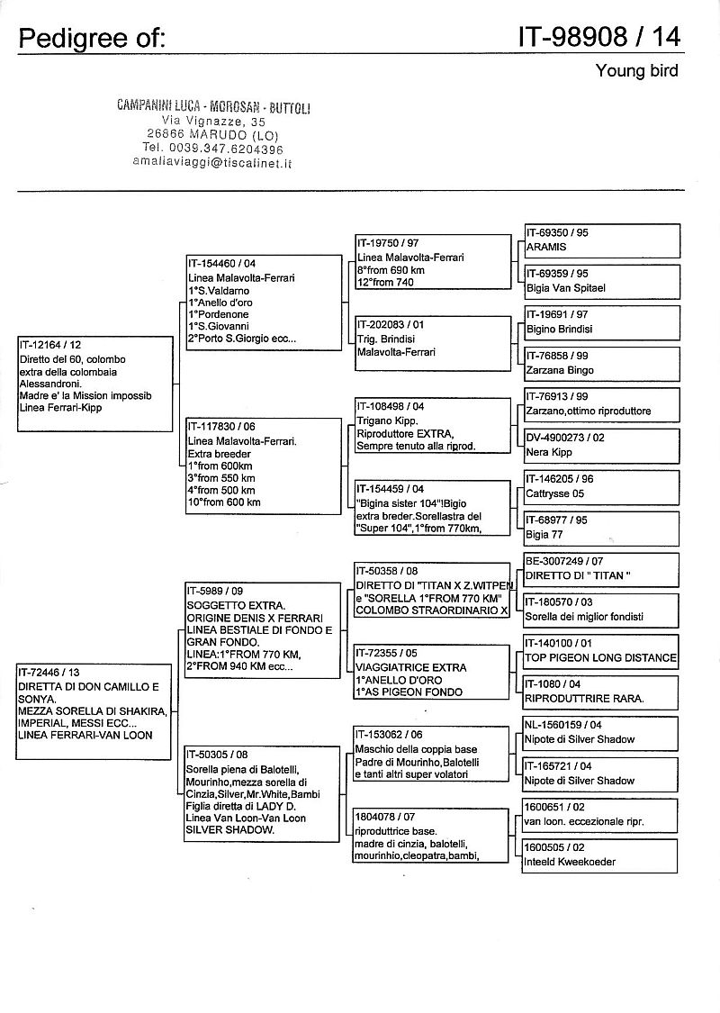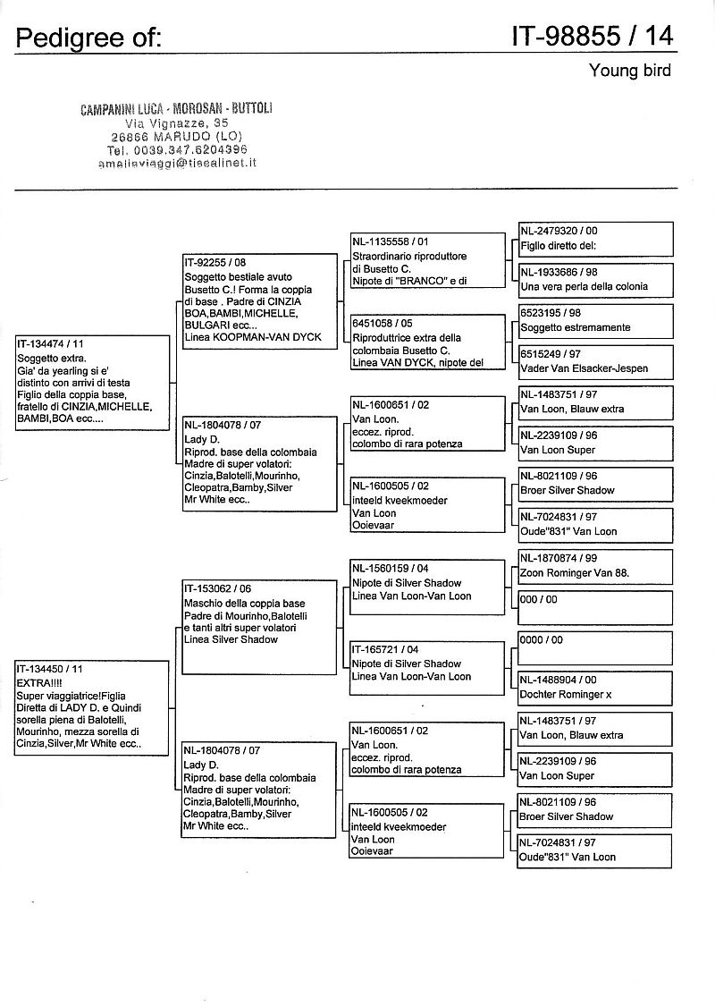 W dniach 10, 11 i 12 maja 2014 roku planujemy zorganizować 3 aukcje gołębi młodych rocznika 2014 tego włoskiego hodowcy. Aukcje będą zorganizowane w Chojnowie, Koziegłówkach i na Wspólnym Gołębniku Mazowsze (Czarna pod Mińskiem Mazowieckim).