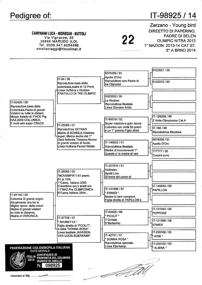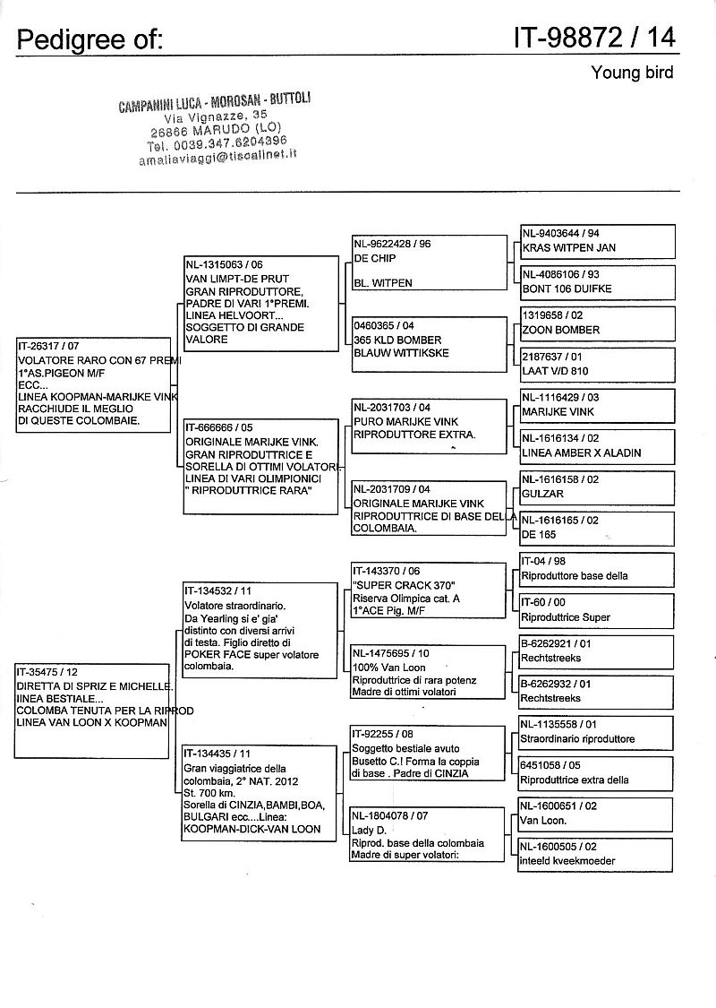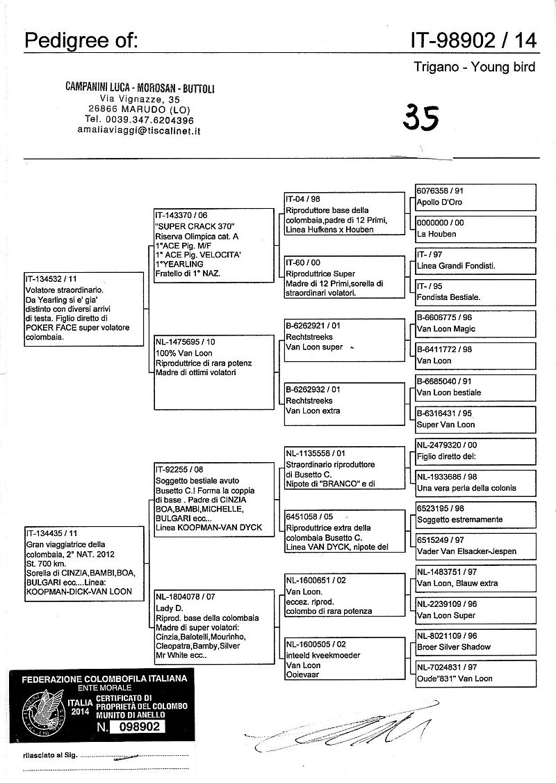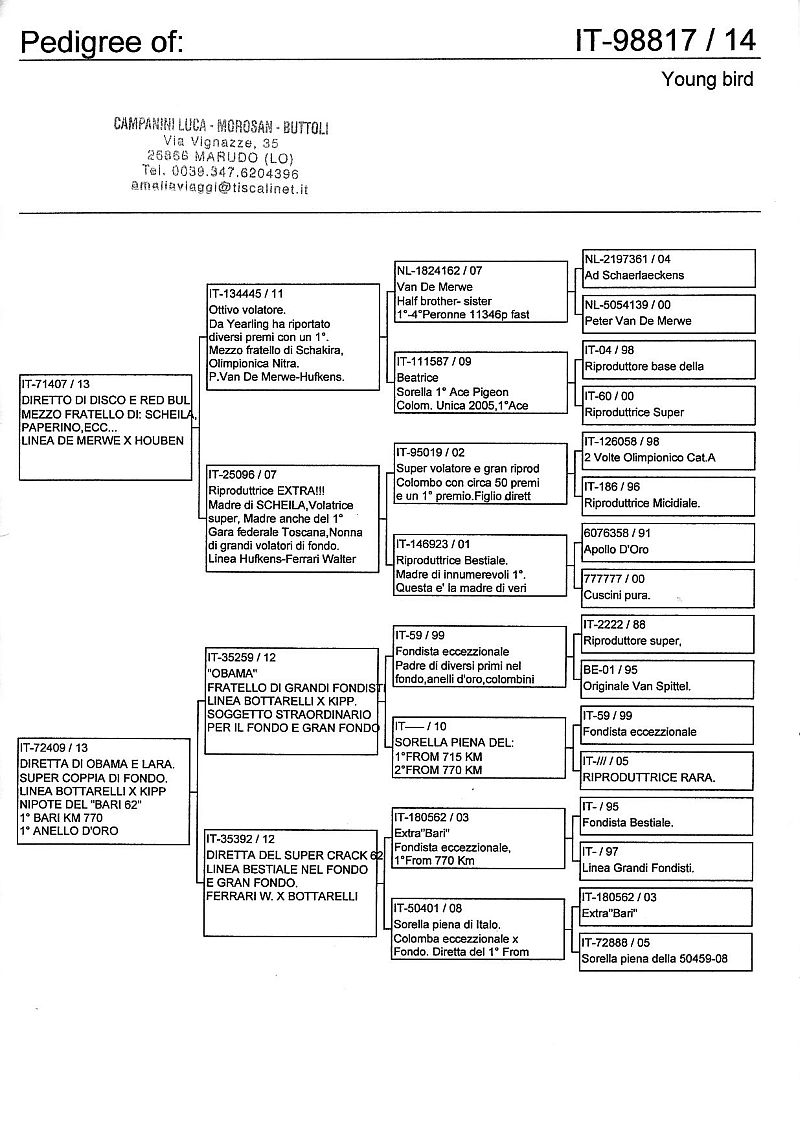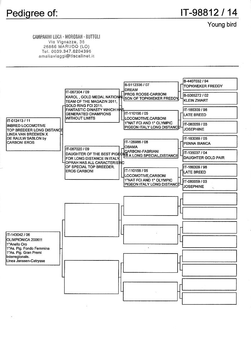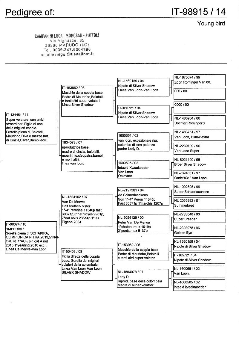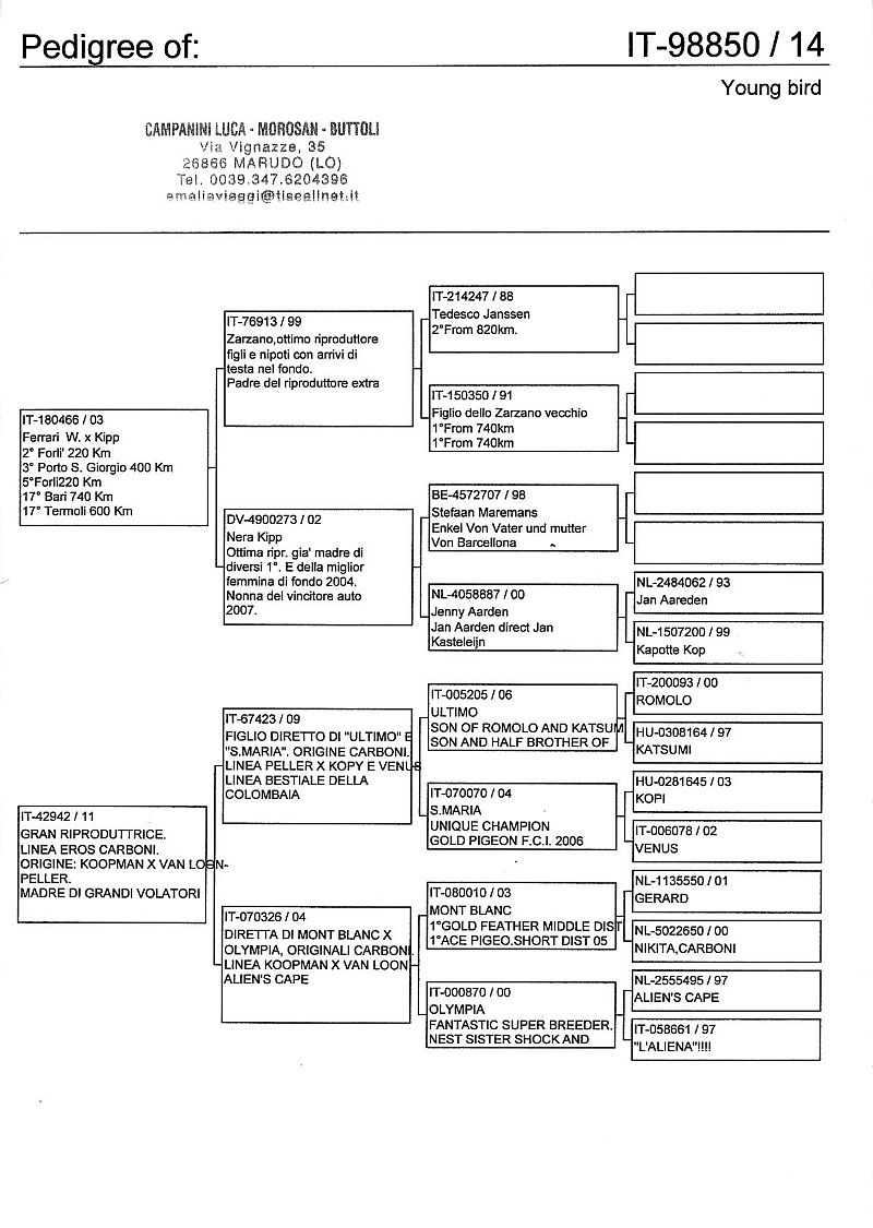 W dniach 10, 11 i 12 maja 2014 roku planujemy zorganizować 3 aukcje gołębi młodych rocznika 2014 tego włoskiego hodowcy. Aukcje będą zorganizowane w Chojnowie, Koziegłówkach i na Wspólnym Gołębniku Mazowsze (Czarna pod Mińskiem Mazowieckim).